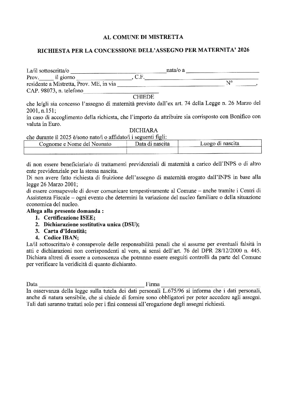 Avviso -Domanda di concessione per "Assegno di Maternità" - anno 2026.-