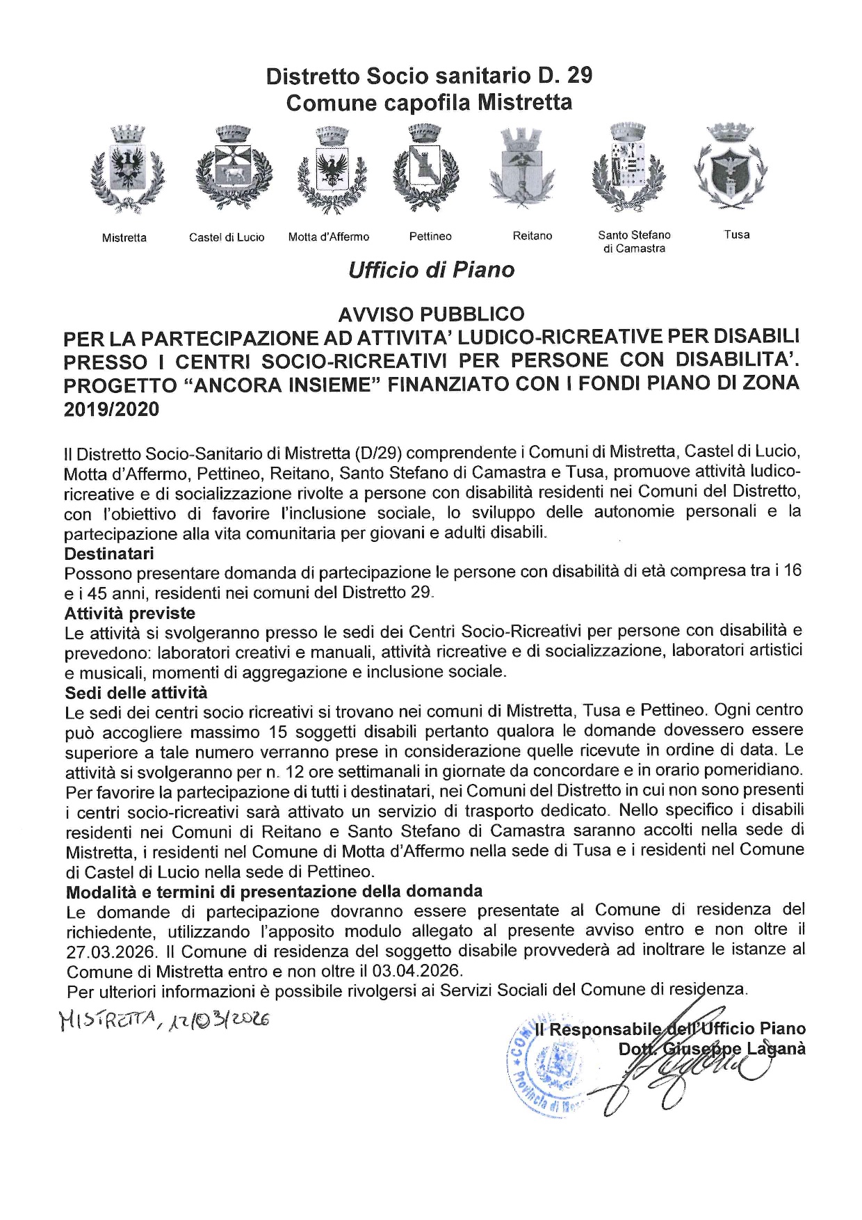 Il Distretto Socio-Sanitario di Mistretta promuove attività ludico-ricreative e di socializzazione rivolte a persone con disabilità residenti nei Comuni del Distretto (Mistretta, Castel di Lucio, Motta d'Affermo, Reitano, Pettineo, Santo Stefano di Camastra e Tusa) con l'obiettivo di favorire l'inclusione sociale, lo sviluppo delle autonomie personali e la partecipazione alla vita comunitaria. Possono presentare domanda di partecipazione le persone con disabilità di età compresa tra i 16 e i 45 anni.