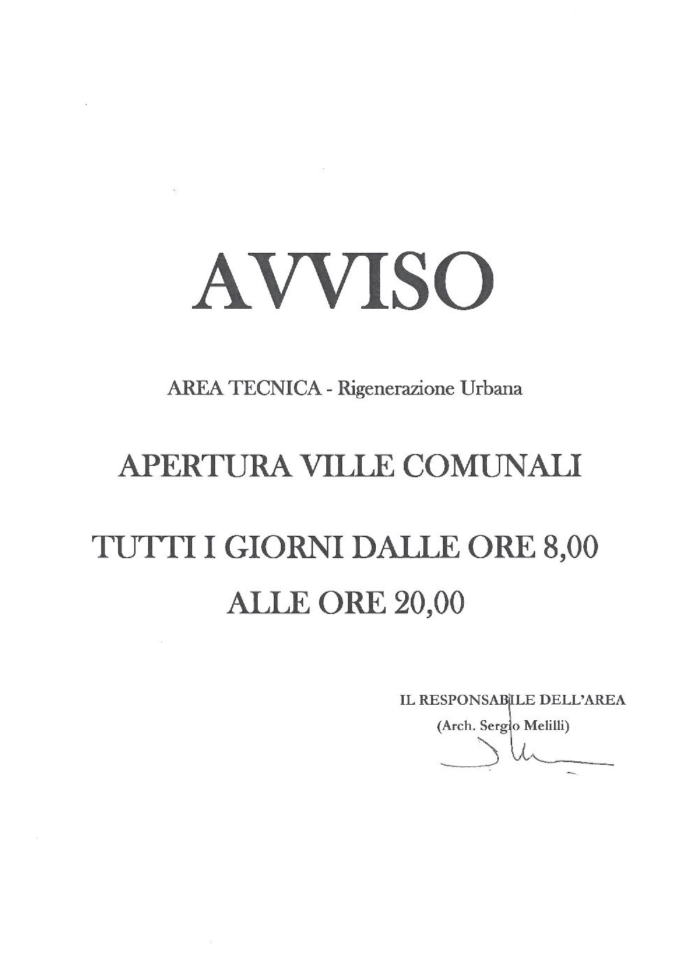 Avviso apertura Ville Comunale tutti i gg. dalle ore 08.00 alle ore 20.00.-