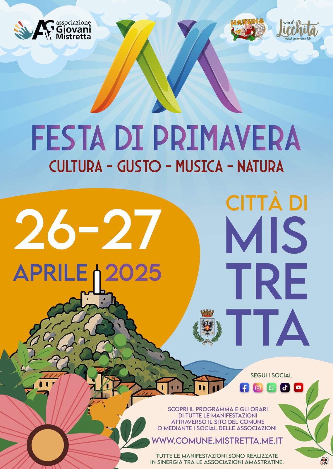 l 26 e 27 aprile non prendete impegni, a Mistretta stiamo organizzando la Festa di primavera. Due giorni tra natura, arte, spettacoli, gastronomia, trekking, bike, equitazione, giochi, musica e tanto altro ancora. Segui l'evento, a breve gli aggiornamenti sulle attività proposte.