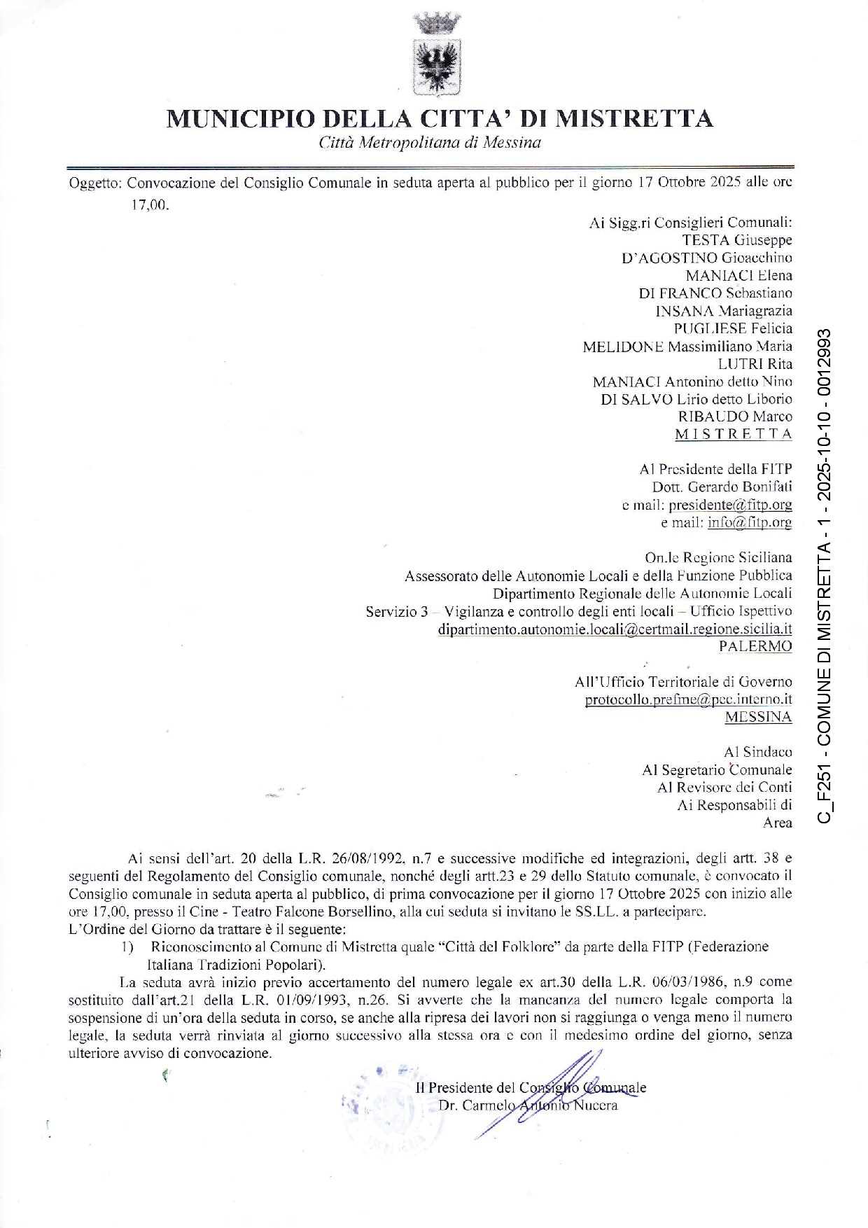 Con nota prot. n.12993 del 10.10.2025 il Presidente del Consiglio Comunale ha convocato il civico consesso in seduta aperta al pubblico per il giorno 17 Ottobre 2025 alle ore 17,00 per la trattazione di n.1 argomenti all'ordine del giorno.