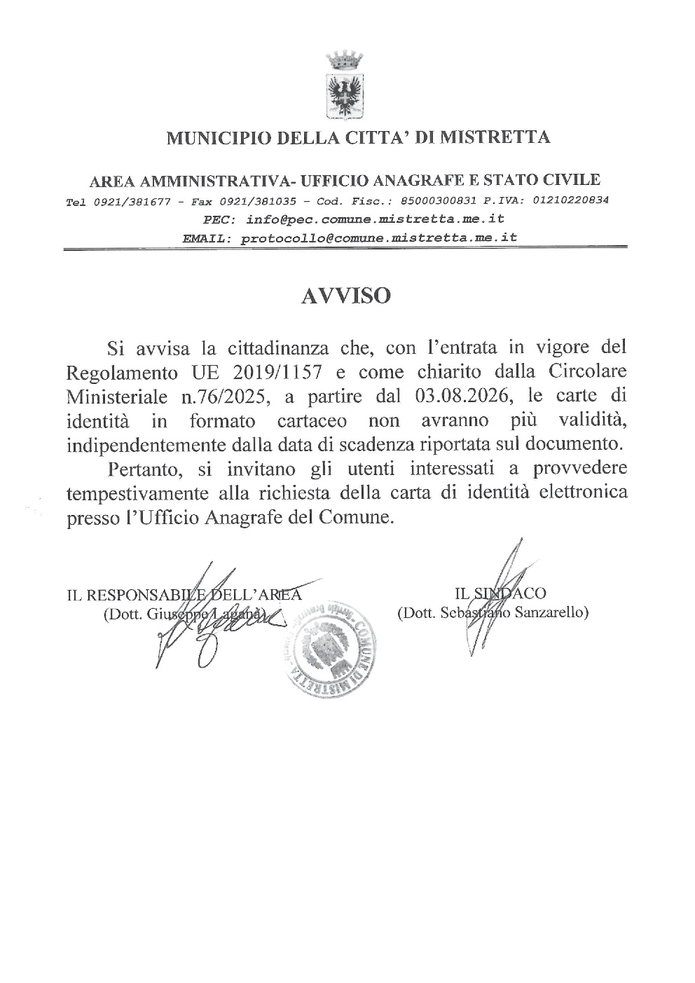 Avviso riguardante la Carta d'Identità Elettronica, giusto regolamento UE. 2019/1157 e come chiarito dalla Circolare Ministeriale n.76/2025, a partire dal 03.08.2026.-