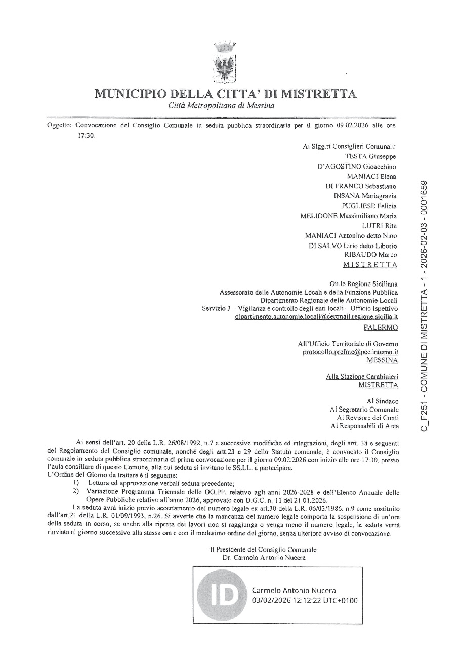 Il Presidente del C.C., con nota prot. n. 1659 del 03.02.2026 ha convocato il Civico consesso in seduta pubblica straordinaria per il giorno 09.02.2026 alle ore 17.30 per la trattazione di n. 2 argomenti dell'o.d.g.